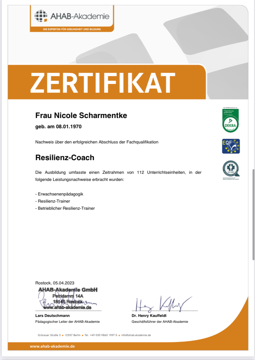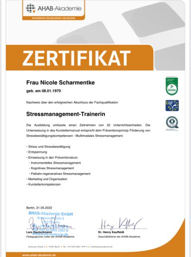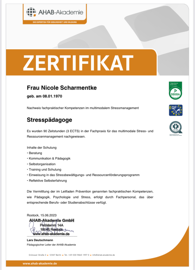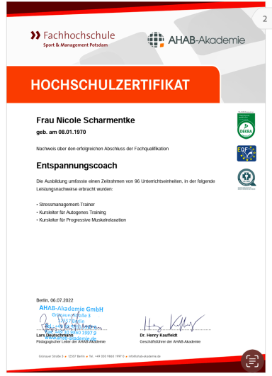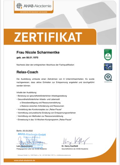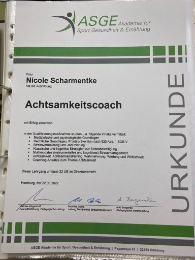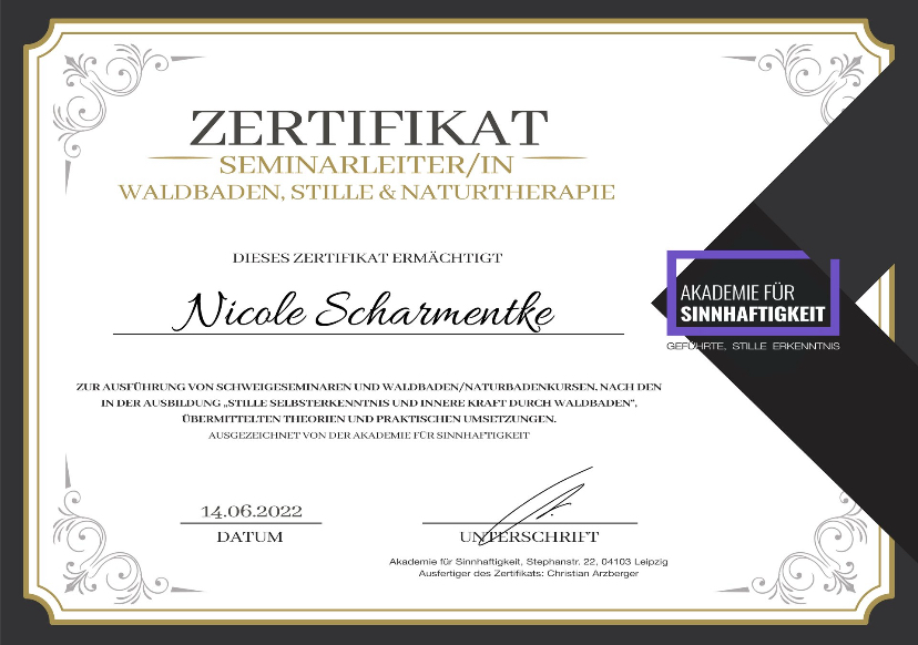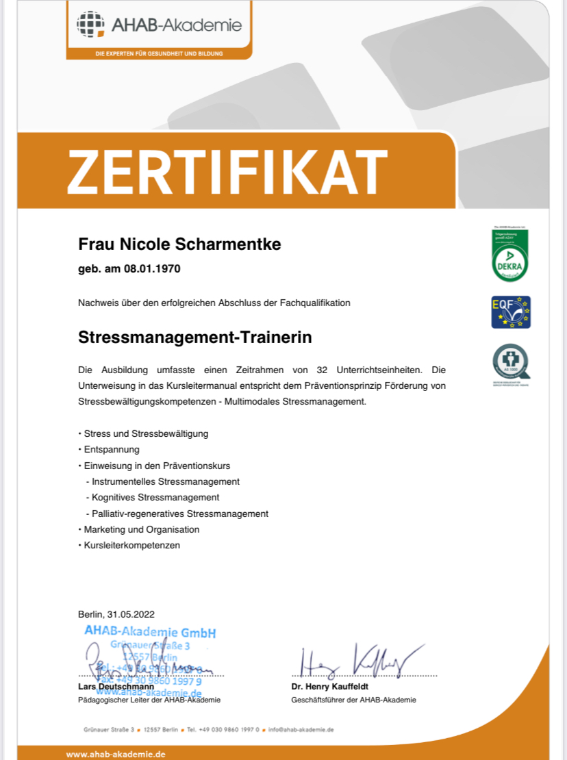 Ich bin ausgebildete Stressmanagement-Trainerin, Entspannungspädagogin und Achtsamkeitscoach. Darüber hinaus verfüge ich über Qualifikationen als Seminarleiterin für Waldbaden, Stuhlyogatrainerin sowie eine Fitnesstrainer C-Lizenz.